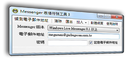 Messenger 表情符號工具是用來備份或還原您MSN中的表情符號設定,常常在重灌系統後,您MSN中的表情或是符號設定都會一併消失,要再重新設定又要花上不少的時間,所以今天有這軟體就能輕鬆的幫您完全備份與還原MSN表情符號設定的工作。