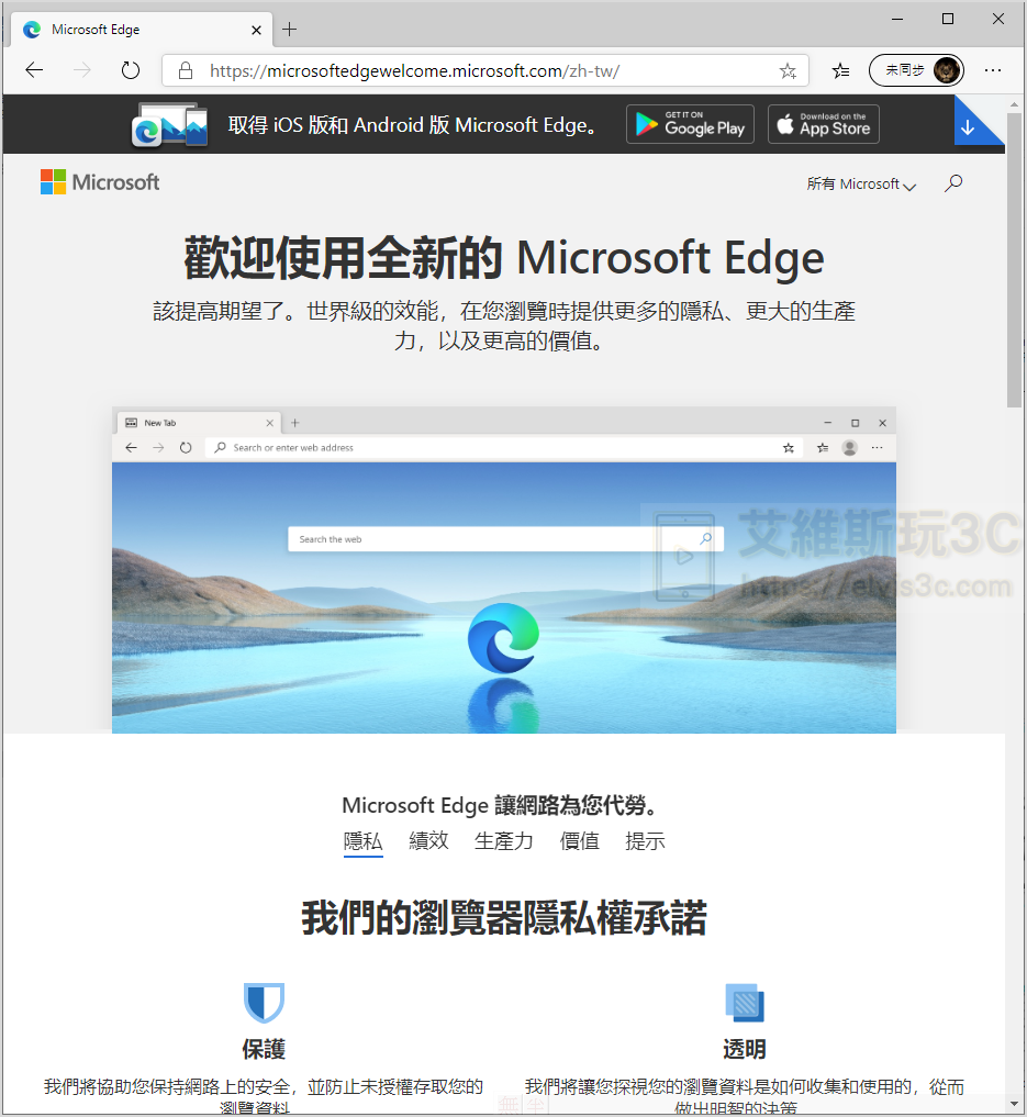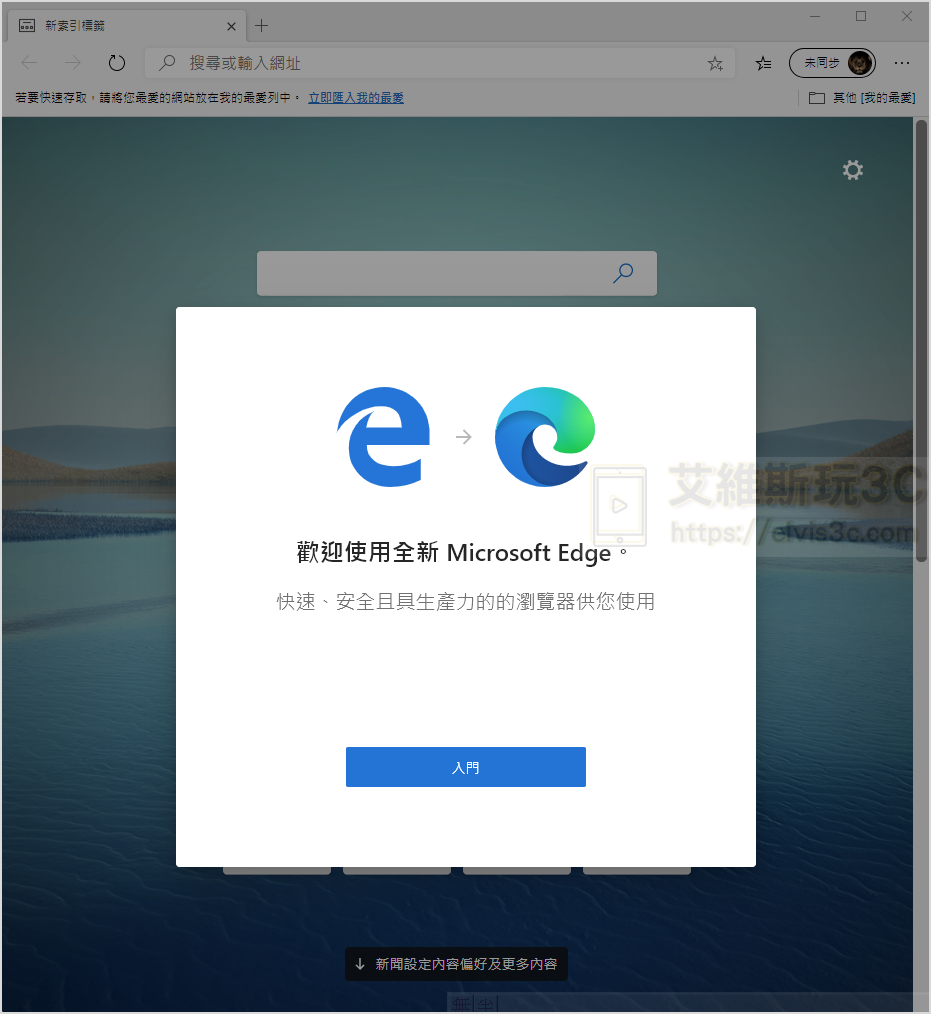 ▼ 在作完基礎的設定後就會進入這個歡迎的畫面,這時您就可以自由體驗這款以 Chrome 開源版本為核心所開發的全新 Edge 與舊版有什麼不同了。