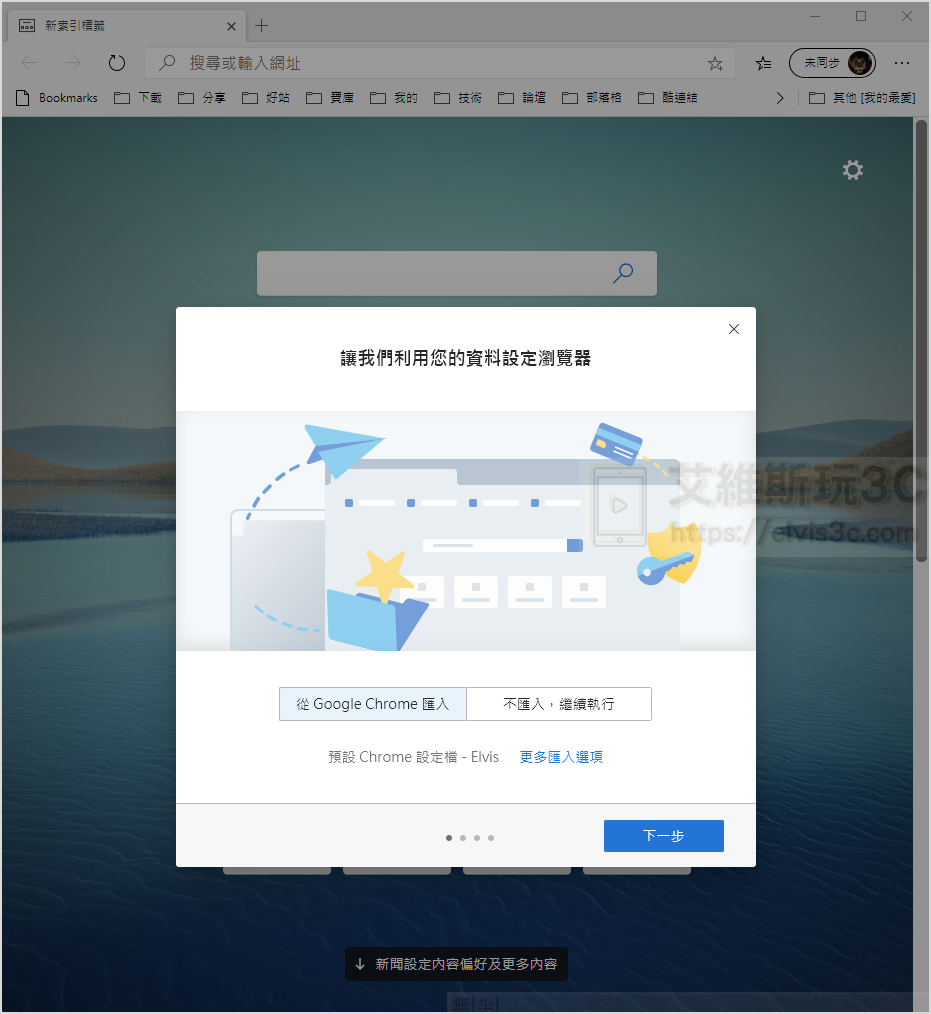 ▼ 在下載安裝完成後開啟您的 Edge 瀏覽器,在這裡會詢問您是否要將 Chrome 的資料匯入 Edge 中,也就是無縫接軌您所慣用的瀏覽器設定。