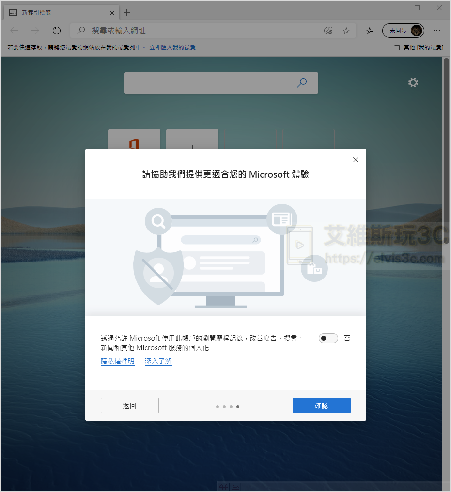 ▼ 這裡會詢問您是否要自動反饋使用Edge的體驗紀錄,個人是不啟用。