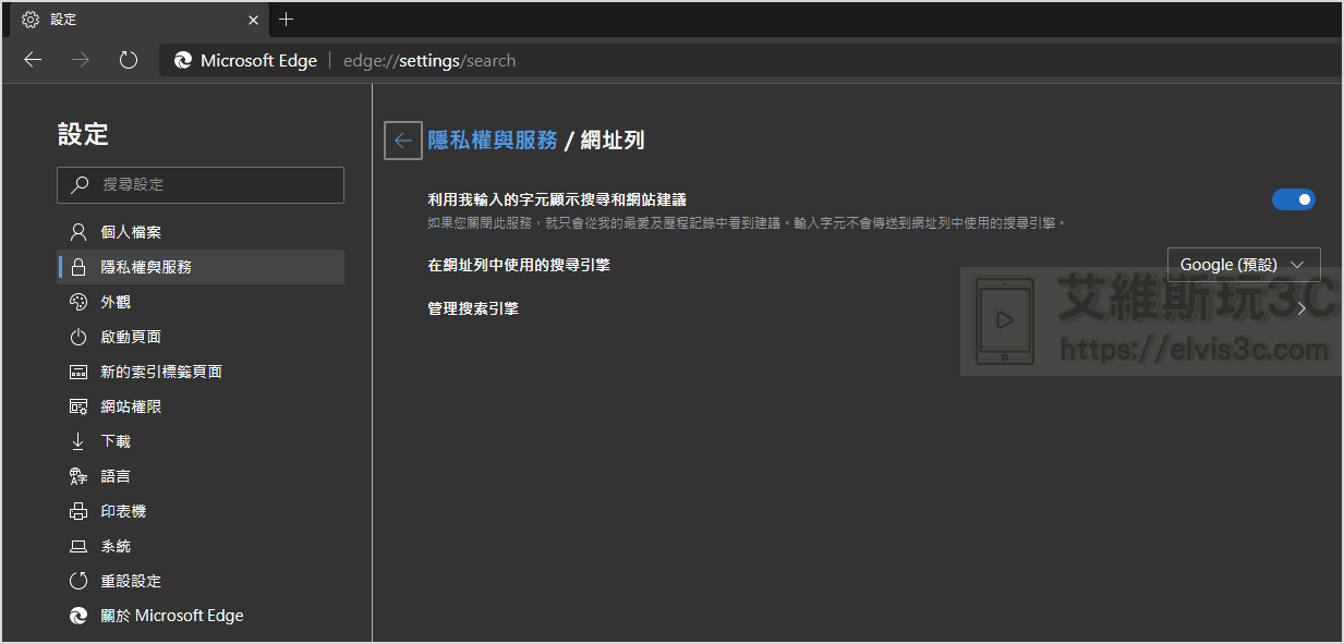 ▼ 因為 Edge 預設的搜尋引擎是自家的 Bing,如果想換回 Google,可以在隱私權與服務的頁籤中進行選擇。