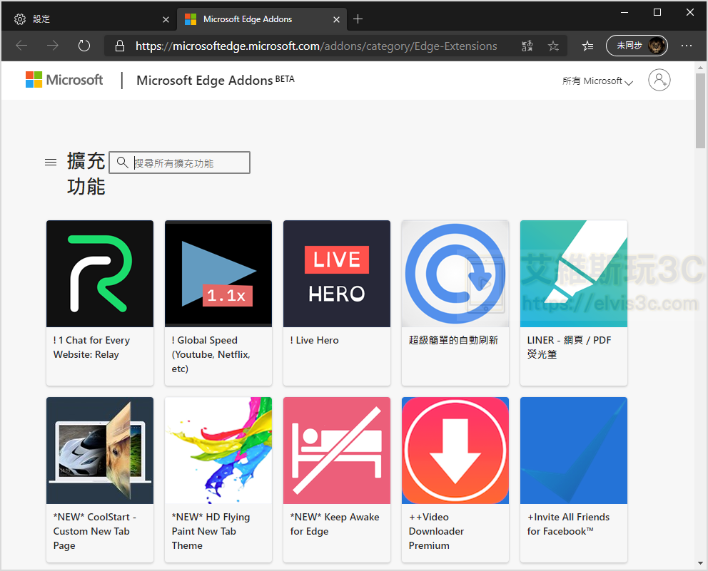 ▼ 最後就是擴充功能的部份,這個與Chrome一樣,目前微軟提供自家的瀏覽器擴充元件商店,請點我下載您所需要的瀏覽器擴充功能元件。