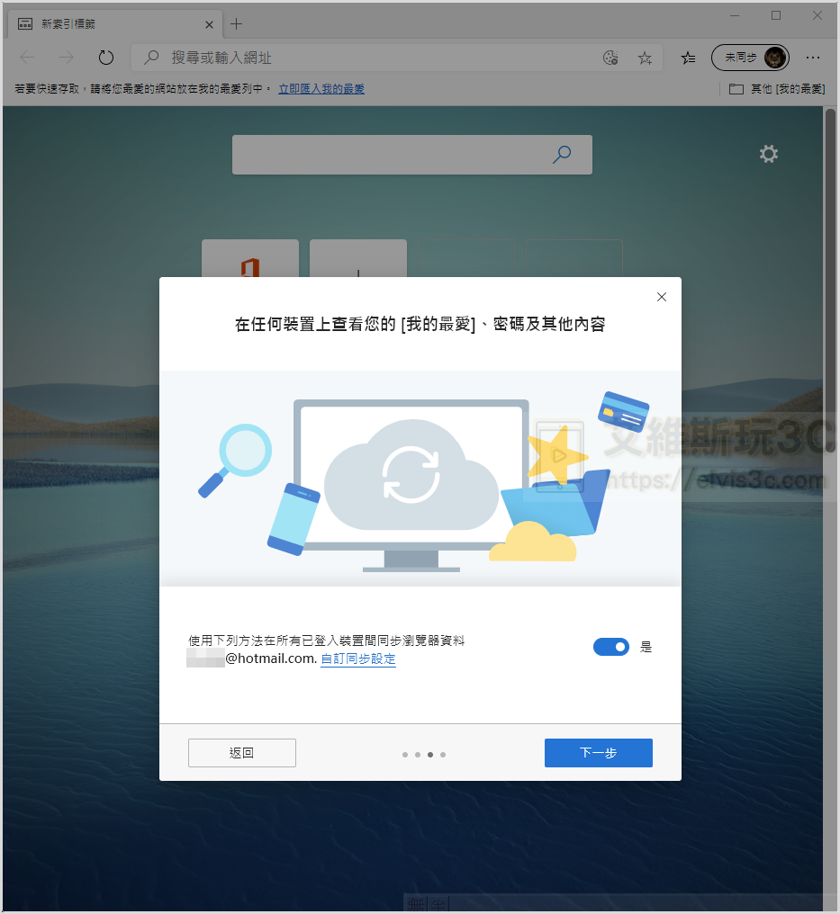 ▼ 在這裡會詢問您是否要透過您的微軟帳號進行瀏覽器的登入同步資料功能,就像在Chrome登入您的Google帳號一樣,可以紀錄您的書籤與密碼等等。