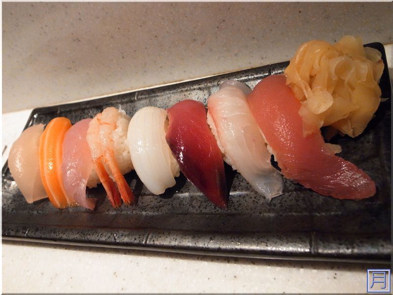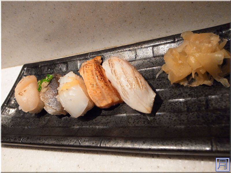 ▲ 依序為炙燒干貝、炙燒秋刀魚、炙燒花枝、炙燒鮭魚、炙燒海壽司,我只能說,經過炙燒過的壽司,油脂充份的溶解,肉質變的更軟嫩,入口即化的口感比沒炙燒過的更明顯,炙燒鮭魚絕對必點,超讚。