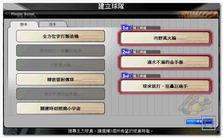 ▼ 球隊沒球員當然不行,選擇您初期球員的屬性,我選擇的是重視守備力。