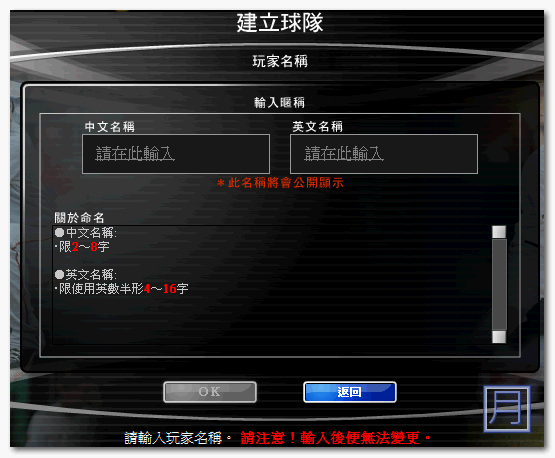 ▼ 接著就要開始建立玩家了,這裡會要求您輸入中文與英文的玩家名稱。