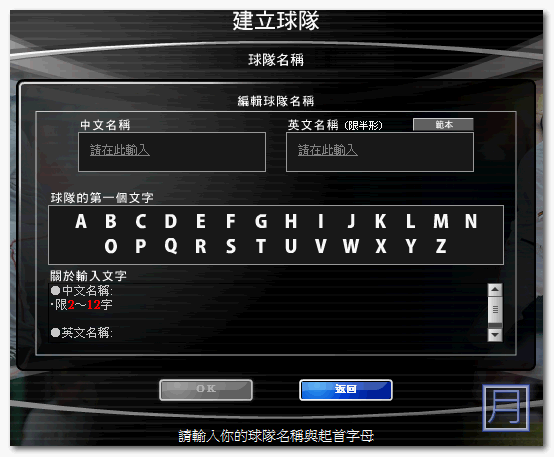 ▼ 再來就要建立球隊了,輸入中文與英文的隊名。