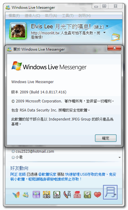 首頁免費軟體即時通訊msn 9 0中文版 msn 9 0中文版 免費軟體, 即時通訊 1 則留言 其實自從MSN2011版推出後評價似乎就不是很優,除了它太過肥大之外,在視窗的整合也非常的混亂,把簡單的MSN搞的超級複雜的啦,用來用去還是覺得MSN9.0是最好用的,尤其是在重灌電腦後又找不到官網9.0版的下載點,在這裡備份給大家抓取囉。 軟體名稱:msn 9 0中文版 軟體類型:即時通訊 軟體版本:9.0 檔案大小:135 MB 官方網站:http://download.live.com/messenger 軟體下載:載點1 | 載點2 標籤:Microsoft, msn 9 0中文版, MSN2011, 免費軟體, 即時通訊, 微軟 一則留言 蘋果米 2011 年 05 月 21 日 我覺得有些軟體 愈改愈複雜又不好用@@ msn就是其中之一 回覆 發表迴響取消回覆