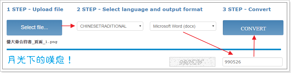 ▼ 點擊 Select file 選擇您想轉文字的圖檔(建議使用PNG,因為失真率比較低不會誤判轉錯字),接著選擇語系與轉換的檔案格式,最後輸入驗證碼後點擊 CONVERT 進行轉換。