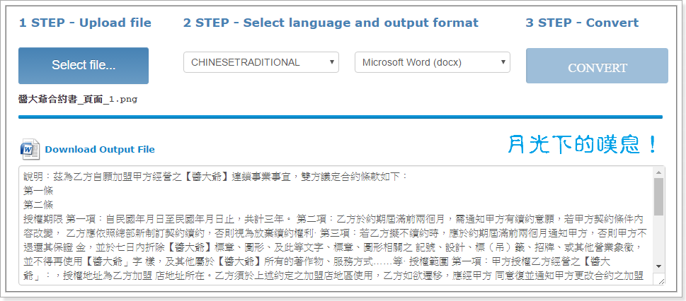 有些合約書或是文件被轉成圖檔後就無法再編輯了,其實我們有其他的方式可以解決,在這裡介紹一款免費的線上圖檔轉文字的服務「Online OCR」,它支援繁簡體的中文轉換,我們只需將圖檔上傳該服務網站,它就能協助我們進行文字轉檔,非常方便實用。