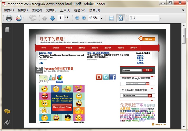 首頁免費資源線上轉檔網頁轉pdf 網頁儲存工具 PDFmyURL.com 網頁轉pdf 網頁儲存工具 PDFmyURL.com 免費資源, 線上轉檔 2 則留言 PDFmyURL 是一個用來將網頁轉換成 PDF 檔的服務網站,它能將您指定的頁面轉換成 PDF 檔,讓您可以更容易連圖帶字保存您喜歡的網頁或是文章。 網頁轉PDF:PDFmyURL.com ▼ 請在欄位中輸入您想擷取的網頁網址,按下橘色的「P」按鈕。 ▼ 等待轉檔完成會跳出儲存的視窗。 ▼ 轉換的完成度極高,可以說是完整的擷取整個網頁,這樣一來保存喜歡的文章就更方便了。 標籤:下載, 免費資源, 網頁儲存, 網頁轉 pdf 軟體, 網頁轉pdf檔 2 則留言 GoGo 2010 年 06 月 21 日 http://www.web2pdfconvert.com 回覆 Elvis 2010 年 06 月 27 日 Dear GoGo, 謝謝您的分享。 回覆 發表迴響取消回覆