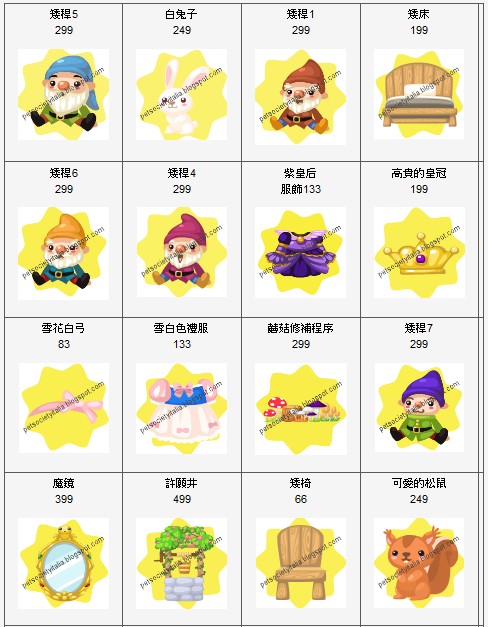 Pet Society 01/11 又更新了,本次更新的商品似乎比較少了些,看來可以讓大家鬆一口氣了,但是萬惡的轉蛋又出現了,這次的轉蛋主題是「白雪公主」,要收集完整可能要費點功夫囉。