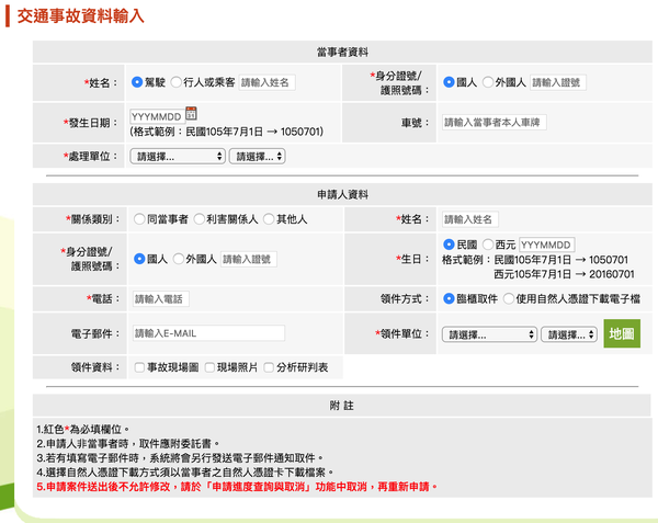 - 填寫交通事故申請資料(包含當事人資料、申請人資料及領件資料)。
