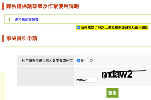 ▼ 進入頁面後點擊交通事故申請的頁籤,請勾選我同意OOXX,是否有人員傷亡選是,然後輸入驗證碼後按確定。