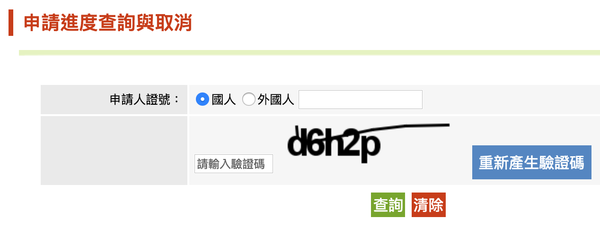 - 點選「申請案件進度查詢與取消」頁籤,輸入「申請人證號」及「驗證碼」後,按「查詢」按鈕。