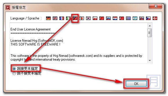 ▼ 第一次啟動時會要您選擇語系,繁體中文請選擇台灣國旗並核選「我接受本協定」。