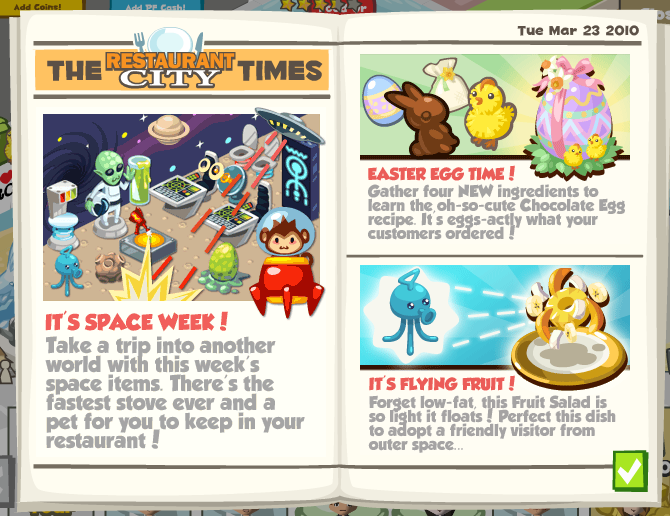 Restaurant City 於 3/23 再度更新,但依然是按照慣例在星期四才把新的裝飾商品上架,本次推出的是外太空星際主題風,有許多與外太空相關的裝飾商品等您採購唷。