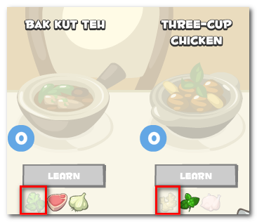 ▼ (Main)主餐多出肉骨茶(新食材:香菜)與三杯雞(新食材:生薑)兩種,紅框中為新增食材。