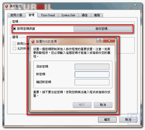▼ 如果您啟動是為了不讓別人亂動您的電腦,您也可以選擇在偏好設定中啟用密碼,這樣人家想解除虛擬模式需要有密碼才行。