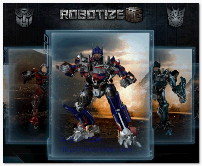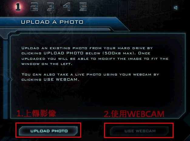 ▼ 共有五個手續,第一步提供您上傳變形金剛的臉孔照片,您可以選擇上傳照片或是使用視訊擷取。