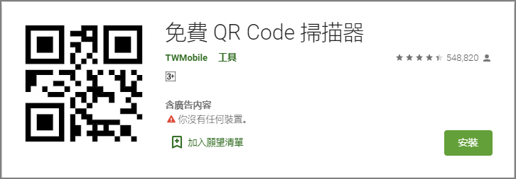 首先我們必須先安裝 Google Play 上的 免費 QR Code 掃描器 APP「請點我」