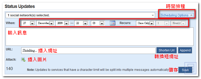 ▼ 點擊「Schedulings Options」可選擇您想發送的日期,然後輸入您想發送的訊息、網址與圖片後按下「Save」儲存。