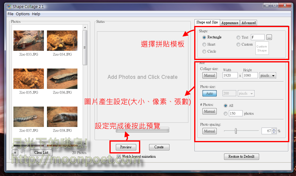 ▼ 右手邊欄位提供拼貼畫的相關設定,比如像拼貼的模板或是拼貼出來的影像大小等等,設定完成後按下【Preview】預覽。