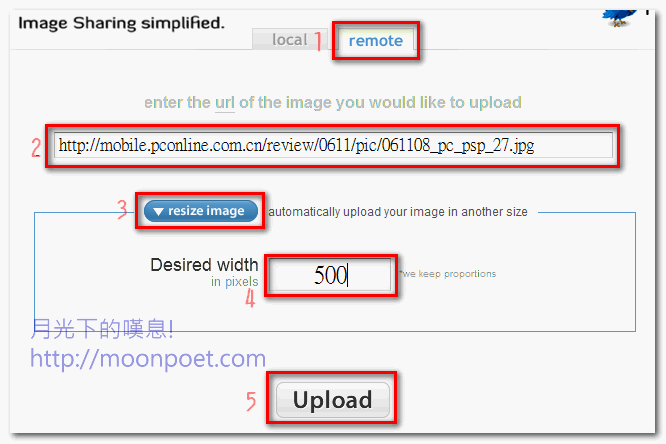 ▼ Local 我就不多說了,remote 的話只要直接將網址貼上欄位,選擇您想調整的寬度後按下「Upload」即可上傳。