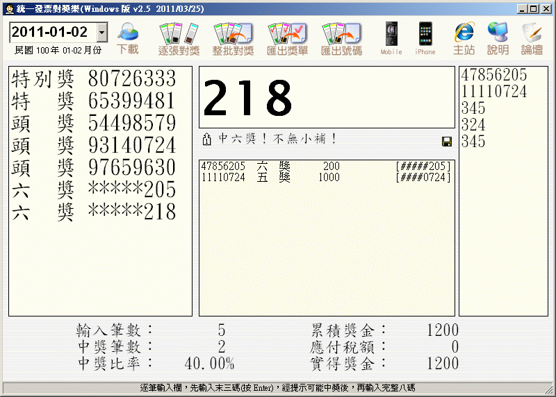 今天艾維斯總算有時間來對對100年5、6月的統一發票,但因為數量太多,對的有點眼花,所以只好在網路上找找可以協助對獎的軟體,就讓我找到這款統一發票對獎樂,它可以用逐筆輸入的方式來對發票,建議您可以先輸入後三碼來對獎,如果有中獎軟體會作語音的提示,這樣就能輸入全碼來進行比對,當然您覺得一筆一筆對太慢,您可以將您所有的發票號碼輸入txt檔案中,讓它批次自動對獎,這樣一來更自動化了。