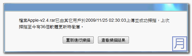 ▼ 此時要是有人也上傳掃瞄過相同的檔案會顯示出有人掃瞄過的訊息,您可以選擇重新掃瞄或是直接觀看其他人的掃瞄結果。