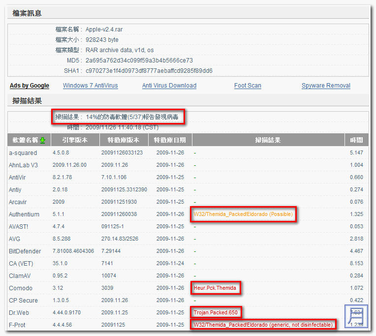 ▼ 掃瞄完成後顯示出所有防毒引擎掃瞄的結果,並統計有多少百分比的防毒軟體發現病毒。