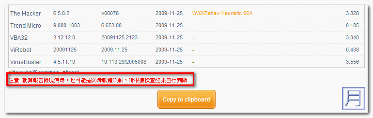 ▼ 最下面會告知您,有些結果有可能是軟體誤判,還是要靠您自行判斷,使用「Copy to clipboard」按鈕可以將結果複製到剪貼簿。