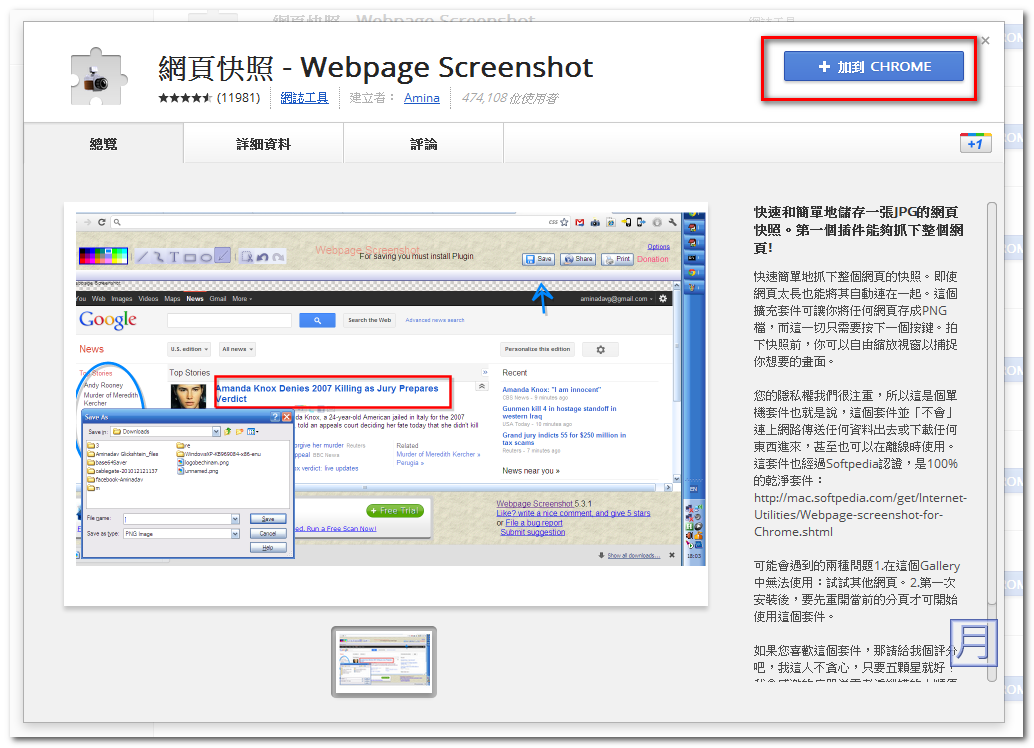 ▼ 請使用 Chrome 開啟 Webpage Screenshot 的下載頁面,點擊右上角的「加到 CHROME」。