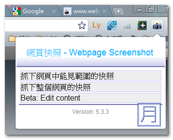 ▼ 再來就能在 Chrome 的右上角看到一個照相機的圖案,在您想擷圖的網頁按下這個按鈕,就會出現功能選單,選擇您想拍的方式,共有三種,第一個是拍下您目前看見的範圍,第二個就是整個頁面從頭到尾的畫面,第三個功能是您可以編輯網頁中的文字再進行拍照,夠酷吧。
