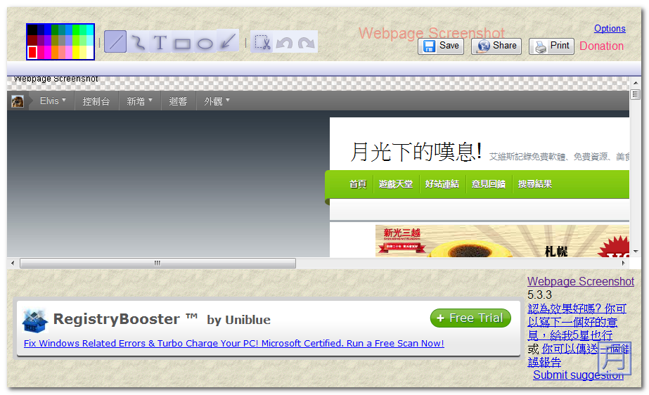 ▼ 拍完後就會跳到 Webpage Screenshot 的編輯功能中,在這裡我們可以對拍下來的畫面進行影像編輯,像是加線加箭頭,或是翻轉、剪圖等,編輯完成後按下右上方的Save就會以下載的方式把圖片存到電腦中了。
